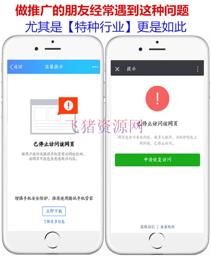 这个源码是,比如你的域名在QQ 微信里面打不开了!这个源码新建的网站绑定的域名在QQ微信里面就可以打开已经被封掉的域名,运作推广使用!!起到的是这个作用!是防封的作用 而不是把你现在已经封了的域名拦截去掉的意思!!需要1个没有被封的域名,然后1个你推广的域名!!! 做网站的尤其是做一些电影站啥的在微信里面推广的或者一些不太好的比如涉及到钱的什么网站,难免在微信QQ里面经常推广的又难免会被QQ微信拦截。 完美解决了QQ、微信链接报毒的情况,通过技术处理后,用户点击即可打开。省去了复制网址再到浏览器粘贴打开的步骤。增加用户信任度。安装说明: 1、上传网站根目录即; 2、将index.php里的网址换成你推广的网址; 3、切记网站绑定的域名一定是没有封禁的。