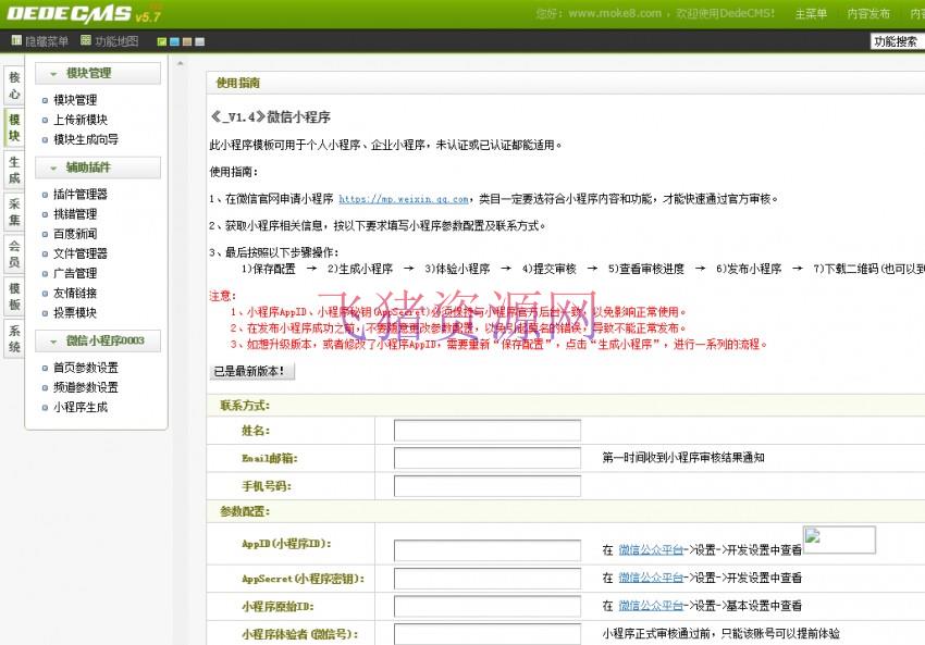 《织梦微信小程序一键生成插件(企业/个人单页模板)》是织梦58发布的便于生成微信小程序的插件,让用户更方便生成企业/个人单页小程序,一次购买多站使用,限时特惠仅售58元安装说明: 1、登录织梦后台,找到左侧菜单‘模块’- ‘上传新模块’ 2、点击确定完成插件的上传 3、点击左侧菜单‘模块’- ‘模块管理’,点击插件名称右边的‘安装’ 4、安装界面可以查看目录是否具有写入权限,需要写入权限才能保证插件的正确安装) 5、‘对于已存在文件处理方法’,请选择‘覆盖’,点击确定即可完成插件的安装) 6、安装好插件后,在‘模块’ – ‘辅助插件’ – ‘微信小程序助手’处填写配置信息