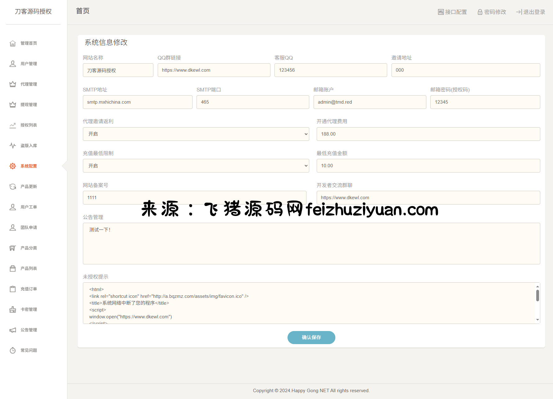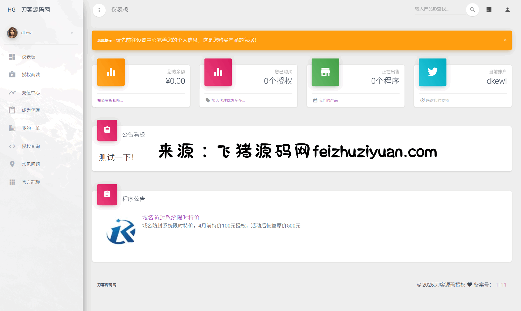 功能最多的授权系统,用户系统,工单系统,精美UI,支付系统,授权管理,产品更新,更新详情,代理返利,发卡系统,授权系统,盗版入库,团队模式,常见问题,等你来体验!
