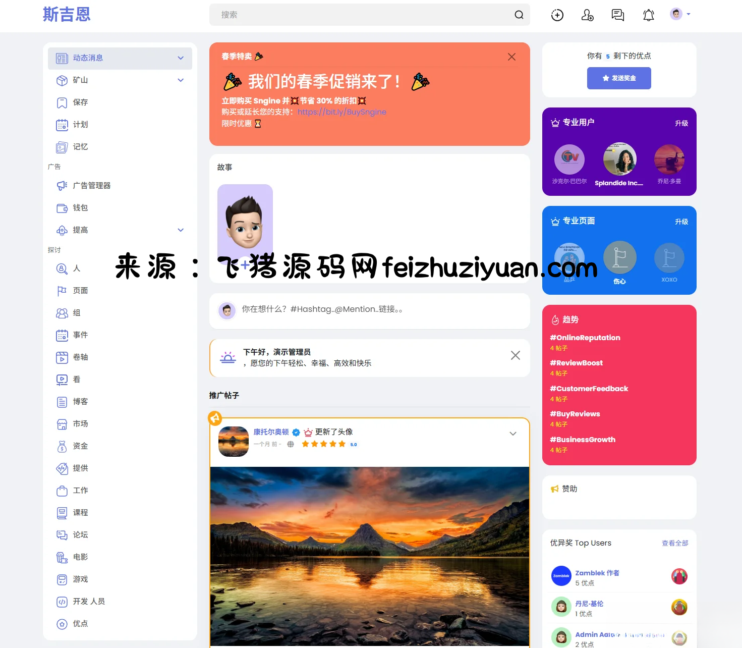 Sngine 4.0.4是一款海外社交平台的PHP源码,包括多语言支持、短视频和博客订阅等特性,类似推特的操作方式。用户可添加好友、关注、分享内容、接收通知,支持YouTube、Vimeo等链接分享,还有隐私设置、验证徽章、实时搜索、表情符号、照片图库等功能。此外,系统提供管理工具,用于管理用户、页面、评论、聊天、群组等,并具备SEO友好性、响应式设计及缓存系统以提升性能,如果不知道什么样可以参考【推特】,喜欢的自行部署吧!