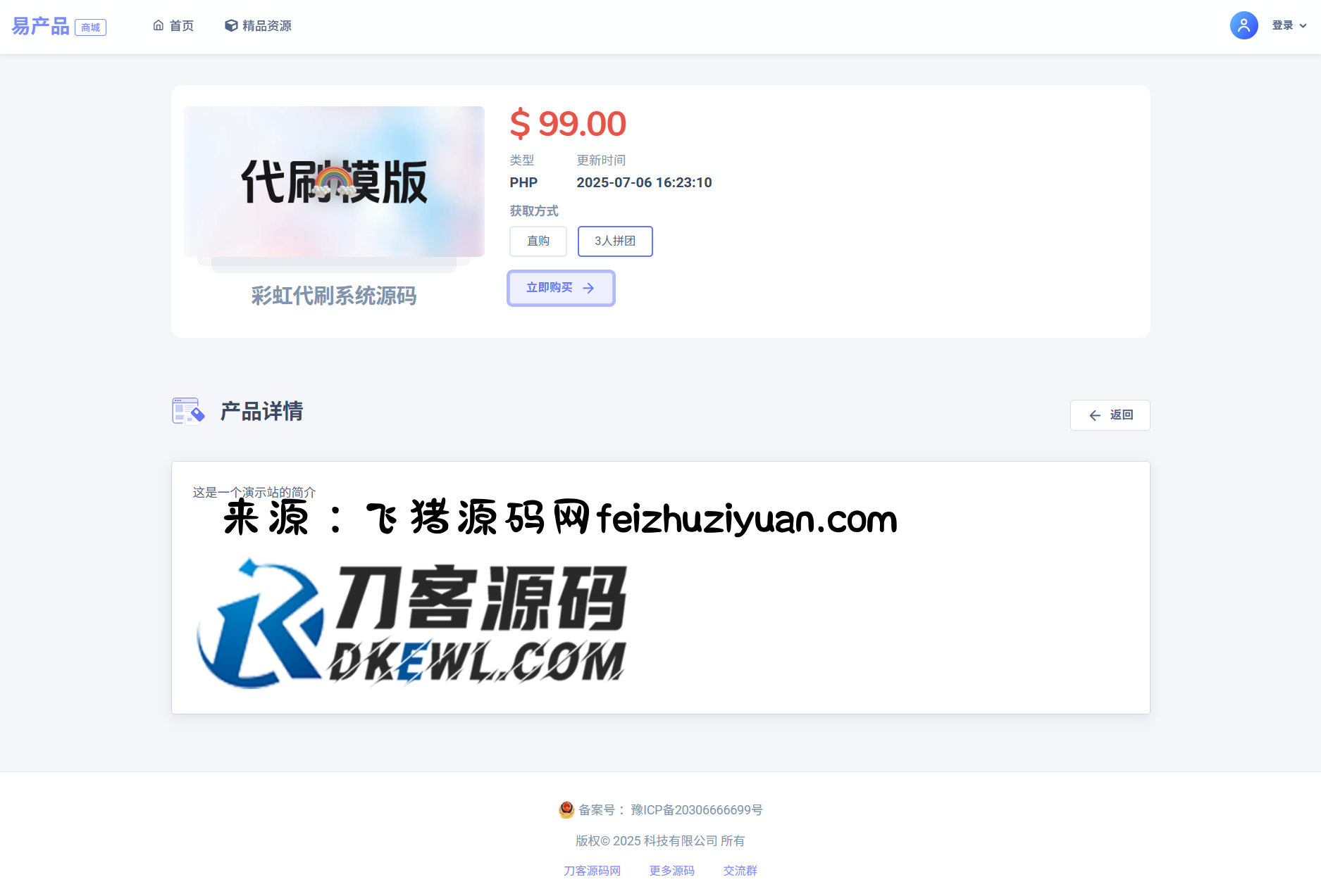 最新团购源码商城 虚拟商城系统源码 全开源feizhuAdmin2个月前更新关注私信74698最新团购源码商城 虚拟商城系统源码 全开源此内容为付费资源,请付费后查看¥2000黄金会员免费钻石会员免费立即购买您当前未登录!建议登陆后购买,可保存购买订单付费资源已售 22 承接技术与支持服务 本站可提供技术支持,另外本站可承接:各类网站、各类平台、各类源码、各类 APP、各类小程序、各类软件、各类盘口、Telegram 所有机器人开发定制、以及手机电脑远控的搭建开发定制都可以,最快当天就能出方案! 提供网站后台、域名、源码、服务器,一站式服务。从注册域名、配置服务器到后期维护全程包办,飞猪站长手把手教到会用,重要项目 3 天内上线,不玩套路,有问题随时找我们免费处理,让您省心又省力! 简介: 最新团购源码商城 虚拟商城系统源码 全开源 基于PHP开发的多功能在线商城系统,适合个人、小型企业或创业团队快速搭建自己的商品销售平台。系统界面美观,功能丰富,支持多种支付方式和灵活的商品管理,助力商家高效开展线上业务 图片: 购买须知 为了避免给您带来不必要的困扰,请务必仔细看下面的说明: 1. 本源码没有任何后门,也不会和我们服务器有任何通信,请您放心使用。 2. 本源码一次性买断,没有二次费用,并享受免费更新。 3. 为了使我们的产品能长久稳定发展,请不要使用我们的产品从事违反中华人民共和国法律、违反公序良俗的活动,否则我们有权拒绝服务,并配合有关单位予以处置。如果您不符合条件,请勿购买。 4. 售后是指通过 Telegram 与客服联系处理问题,售后过期不影响您对主题的使用和更新。免费三个月售后服务。售后服务时间为工作日早9点到晚5点。如果不在线可以 Telegram 留言,我们会尽快给您答复。 5. 售后服务包括程序的使用、BUG 的处理、意见建议等。不包括技术服务、网站优化、二次开发、环境配置、服务器运维等。 6. 代码类商品属于数字化商品,具有可复制性,不支持退款,详见《网络交易管理办法》第二章 第16条 第三类。 7. 购买前请仔细阅读我们的用户协议与免责声明: 用户协议 OR 免责声明。 © 版权声明 © 版权声明 文章版权归作者所有,未经允许请勿转载。本站资源均来自互联网,仅供研究学习,禁止违法使用和商用,产生法律纠纷本站概不负责!如有侵犯您的权益请与我们联系! 1. 欢迎您使用飞猪资源网(以下简称“本站”)。在您使用本站各项服务之前,请仔细阅读本《免责声明》。 2. 凡以任何方式登陆、浏览本站内容或直接、间接使用本站内容者,视为同意本站《免责声明》。 3. 本站提供的程序源码没有附带任何运营数据,只保证程序功能合法性、完整性。购买后对程序添加数据属于个人行为,与本站和开发者无关。 4. 本站不给涉黄、涉黑、涉赌、涉毒、涉电信诈骗等任何涉嫌违法活动站点提供任何技术帮助,如发现源码被用于非法站点,本站将列入售后黑名单,永不再提供任何服务。 5. 程序代码仅供学习用途,不得商用。违者导致的侵权、违法等后果需自行承担法律责任,本站和程序开发者不承担任何连带责任。 6. 未经本站允许不得将源码进行转售、分发等行为,请尊重作者劳动成果和版权,谢谢支持。 7. 本网页及演示站内容、图片、视频为模板演示数据,所有图片均来源于网络,版权归原作者所有。如有侵权,请联系我们书面反馈,核实后将立即删除。 8. 本站有权根据实际需要修改本协议,服务条款的解释权与修改权归本站所有。 THE END网站源码 文章版权归作者所有,未经允许请勿转载。本站资源均来自互联网,仅供研究学习,禁止违法使用和商用,产生法律纠纷本站概不负责!如果侵犯了您的权益请与我们联系!点赞98赞赏 分享QQ空间微博QQ好友海报分享复制链接收藏