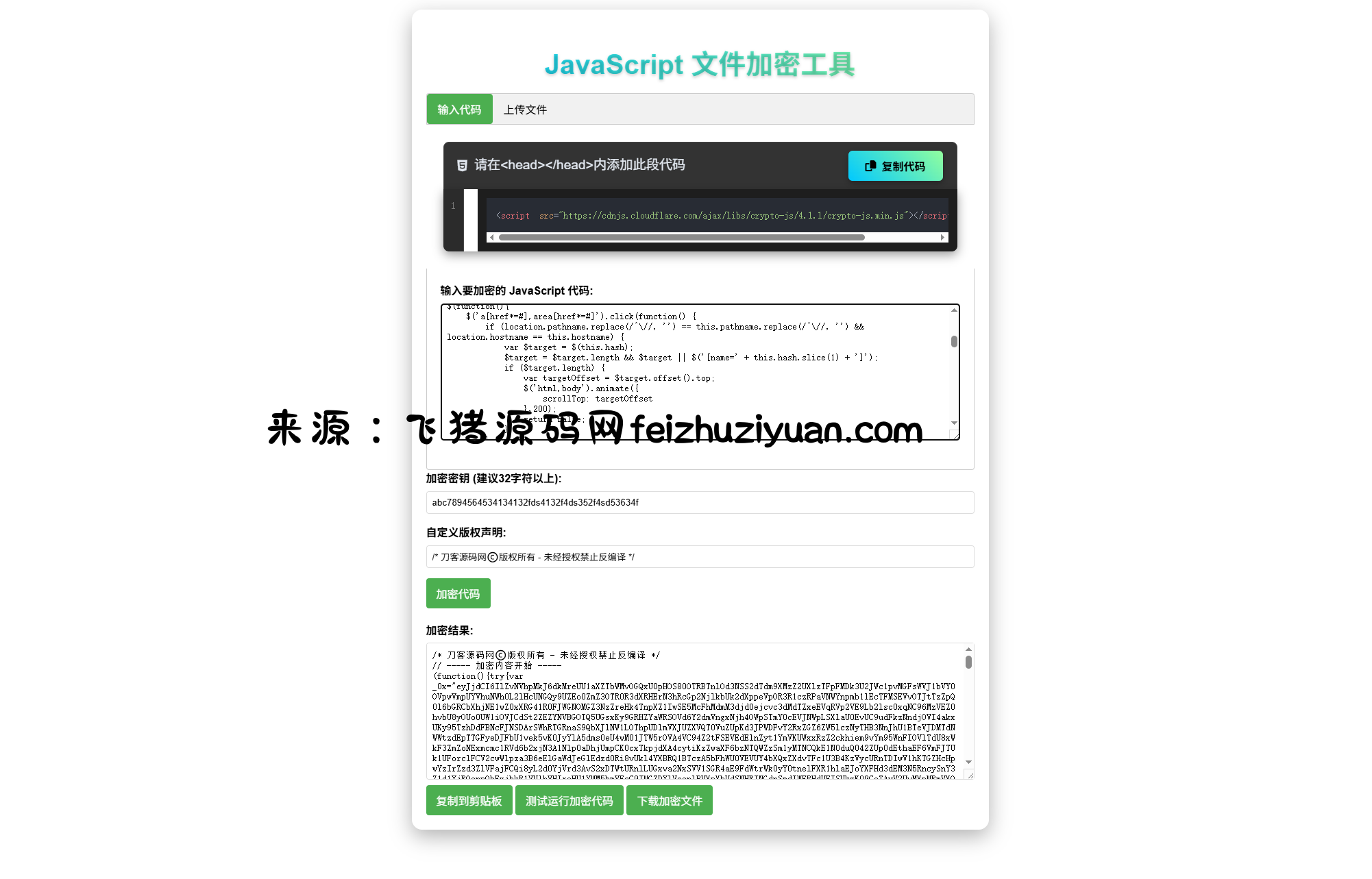 JavaScript代码在线加密工具源码feizhuAdmin2个月前更新关注私信810103JavaScript代码在线加密工具源码此内容为付费资源,请付费后查看¥2000黄金会员免费钻石会员免费立即购买您当前未登录!建议登陆后购买,可保存购买订单付费资源已售 22 承接技术与支持服务 本站可提供技术支持,另外本站可承接:各类网站、各类平台、各类源码、各类 APP、各类小程序、各类软件、各类盘口、Telegram 所有机器人开发定制、以及手机电脑远控的搭建开发定制都可以,最快当天就能出方案! 提供网站后台、域名、源码、服务器,一站式服务。从注册域名、配置服务器到后期维护全程包办,飞猪站长手把手教到会用,重要项目 3 天内上线,不玩套路,有问题随时找我们免费处理,让您省心又省力! 简介: JavaScript代码在线加密工具源码 -支持代码部分和文件上传 -仅支持JS代码,其它代码加密后会运行出错 -可自定义版权提示 -自定义密钥 -支持加密后的代码以文件形式下载 图片: 购买须知 为了避免给您带来不必要的困扰,请务必仔细看下面的说明: 1. 本源码没有任何后门,也不会和我们服务器有任何通信,请您放心使用。 2. 本源码一次性买断,没有二次费用,并享受免费更新。 3. 为了使我们的产品能长久稳定发展,请不要使用我们的产品从事违反中华人民共和国法律、违反公序良俗的活动,否则我们有权拒绝服务,并配合有关单位予以处置。如果您不符合条件,请勿购买。 4. 售后是指通过 Telegram 与客服联系处理问题,售后过期不影响您对主题的使用和更新。免费三个月售后服务。售后服务时间为工作日早9点到晚5点。如果不在线可以 Telegram 留言,我们会尽快给您答复。 5. 售后服务包括程序的使用、BUG 的处理、意见建议等。不包括技术服务、网站优化、二次开发、环境配置、服务器运维等。 6. 代码类商品属于数字化商品,具有可复制性,不支持退款,详见《网络交易管理办法》第二章 第16条 第三类。 7. 购买前请仔细阅读我们的用户协议与免责声明: 用户协议 OR 免责声明。 © 版权声明 © 版权声明 文章版权归作者所有,未经允许请勿转载。本站资源均来自互联网,仅供研究学习,禁止违法使用和商用,产生法律纠纷本站概不负责!如有侵犯您的权益请与我们联系! 1. 欢迎您使用飞猪资源网(以下简称“本站”)。在您使用本站各项服务之前,请仔细阅读本《免责声明》。 2. 凡以任何方式登陆、浏览本站内容或直接、间接使用本站内容者,视为同意本站《免责声明》。 3. 本站提供的程序源码没有附带任何运营数据,只保证程序功能合法性、完整性。购买后对程序添加数据属于个人行为,与本站和开发者无关。 4. 本站不给涉黄、涉黑、涉赌、涉毒、涉电信诈骗等任何涉嫌违法活动站点提供任何技术帮助,如发现源码被用于非法站点,本站将列入售后黑名单,永不再提供任何服务。 5. 程序代码仅供学习用途,不得商用。违者导致的侵权、违法等后果需自行承担法律责任,本站和程序开发者不承担任何连带责任。 6. 未经本站允许不得将源码进行转售、分发等行为,请尊重作者劳动成果和版权,谢谢支持。 7. 本网页及演示站内容、图片、视频为模板演示数据,所有图片均来源于网络,版权归原作者所有。如有侵权,请联系我们书面反馈,核实后将立即删除。 8. 本站有权根据实际需要修改本协议,服务条款的解释权与修改权归本站所有。 THE END网站源码 文章版权归作者所有,未经允许请勿转载。本站资源均来自互联网,仅供研究学习,禁止违法使用和商用,产生法律纠纷本站概不负责!如果侵犯了您的权益请与我们联系!点赞103赞赏 分享QQ空间微博QQ好友海报分享复制链接收藏