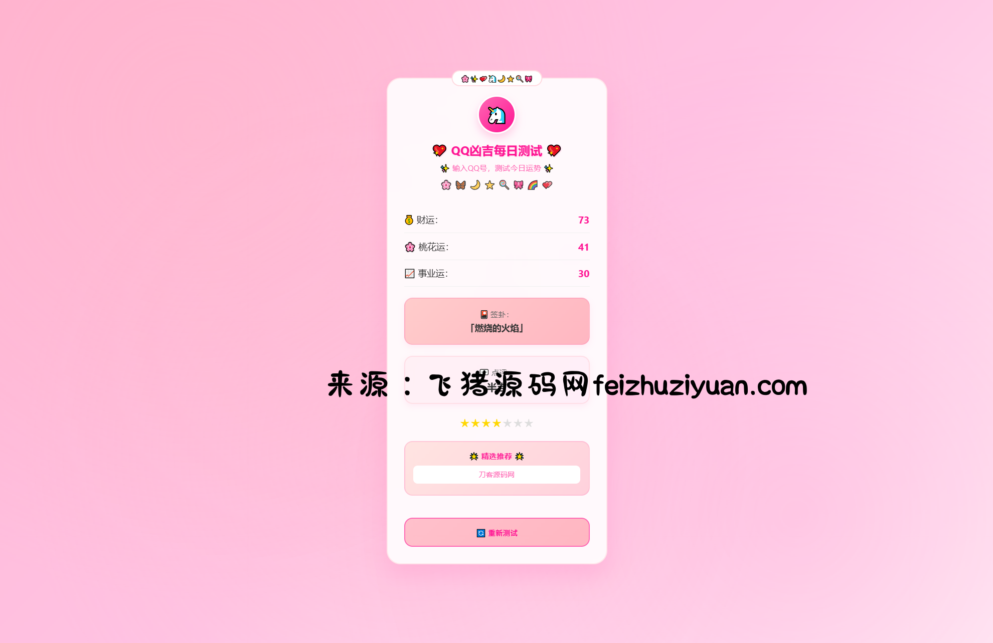 这是一个超级可爱的QQ每日运势测试网页应用,采用梦幻粉白色系设计