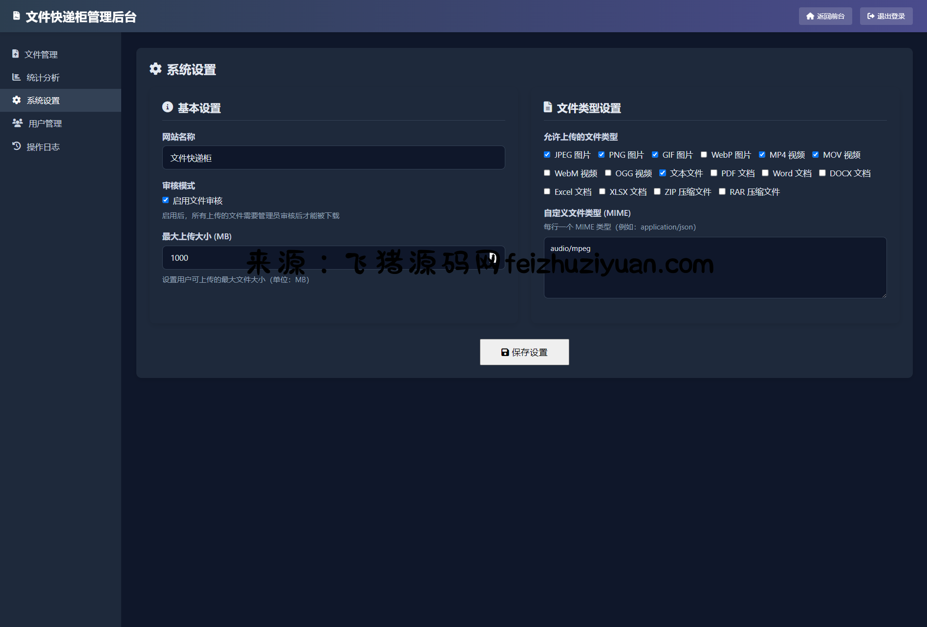 1.后台支持网站配置(支持网站名称,启用,关闭审核,支持文件上传大小设置,支持文件类型设置)