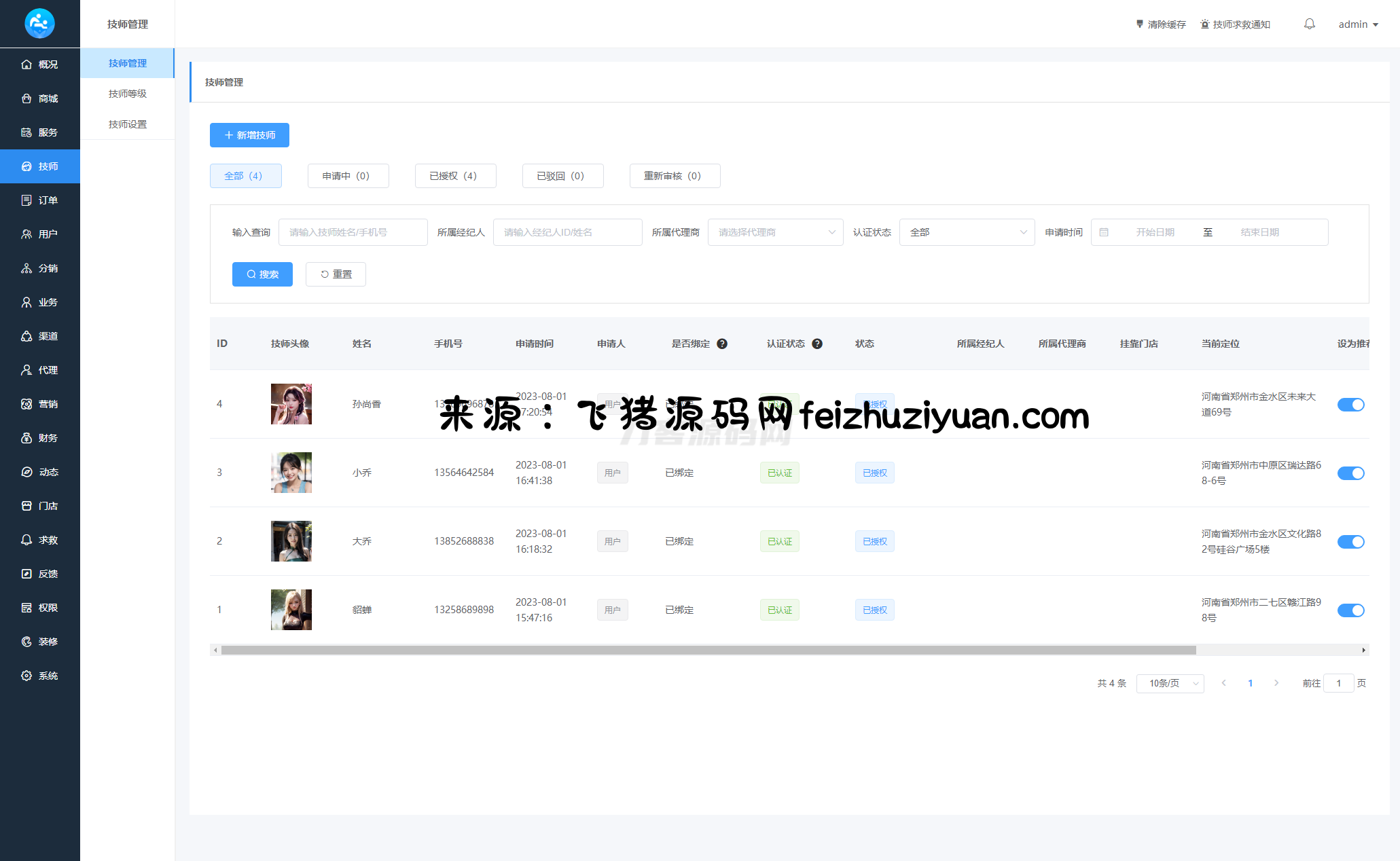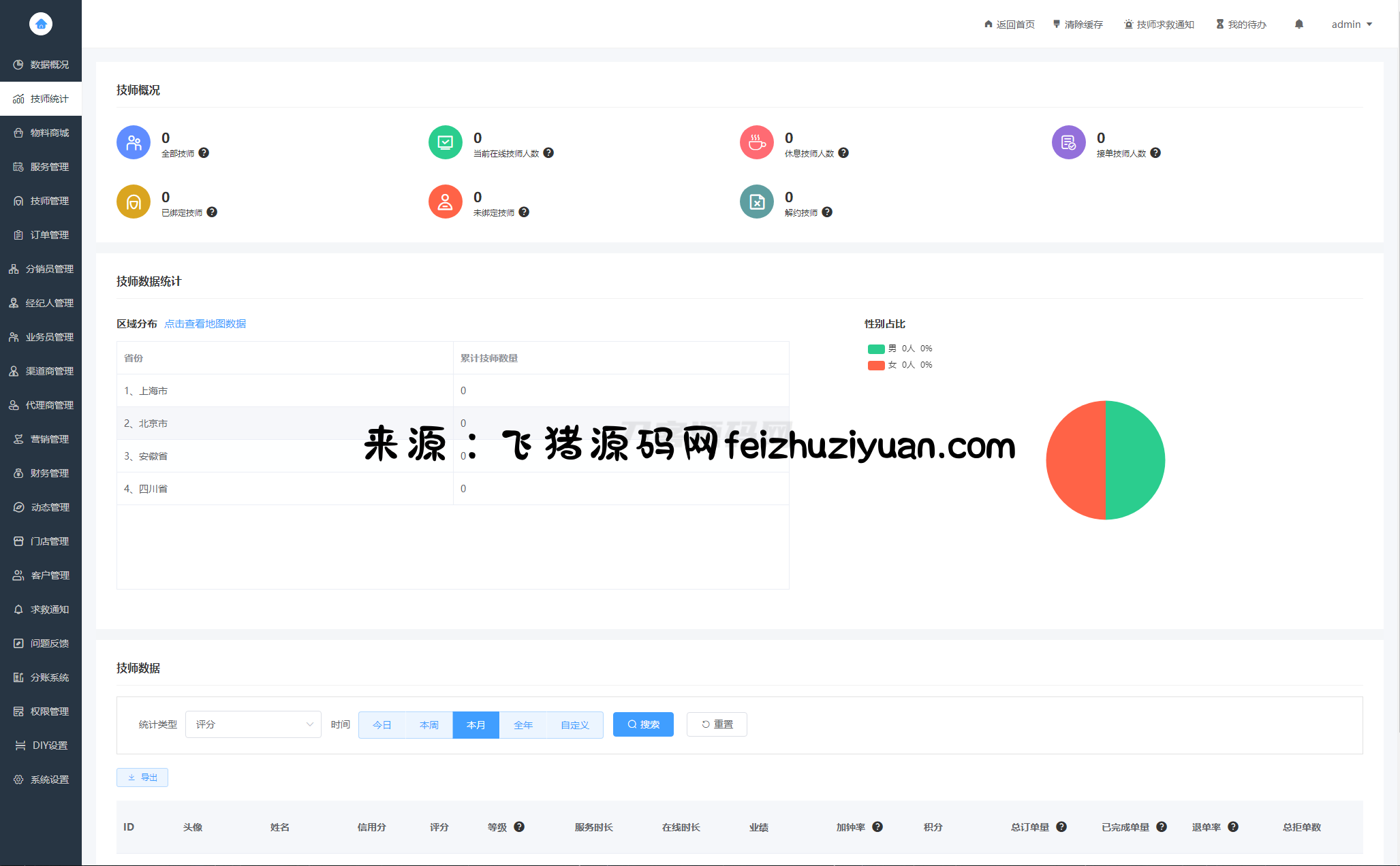 27、后台新增:技师统计(技师概况、技师数据统计、区域分布、技师数据等,可视化数据一目了然)