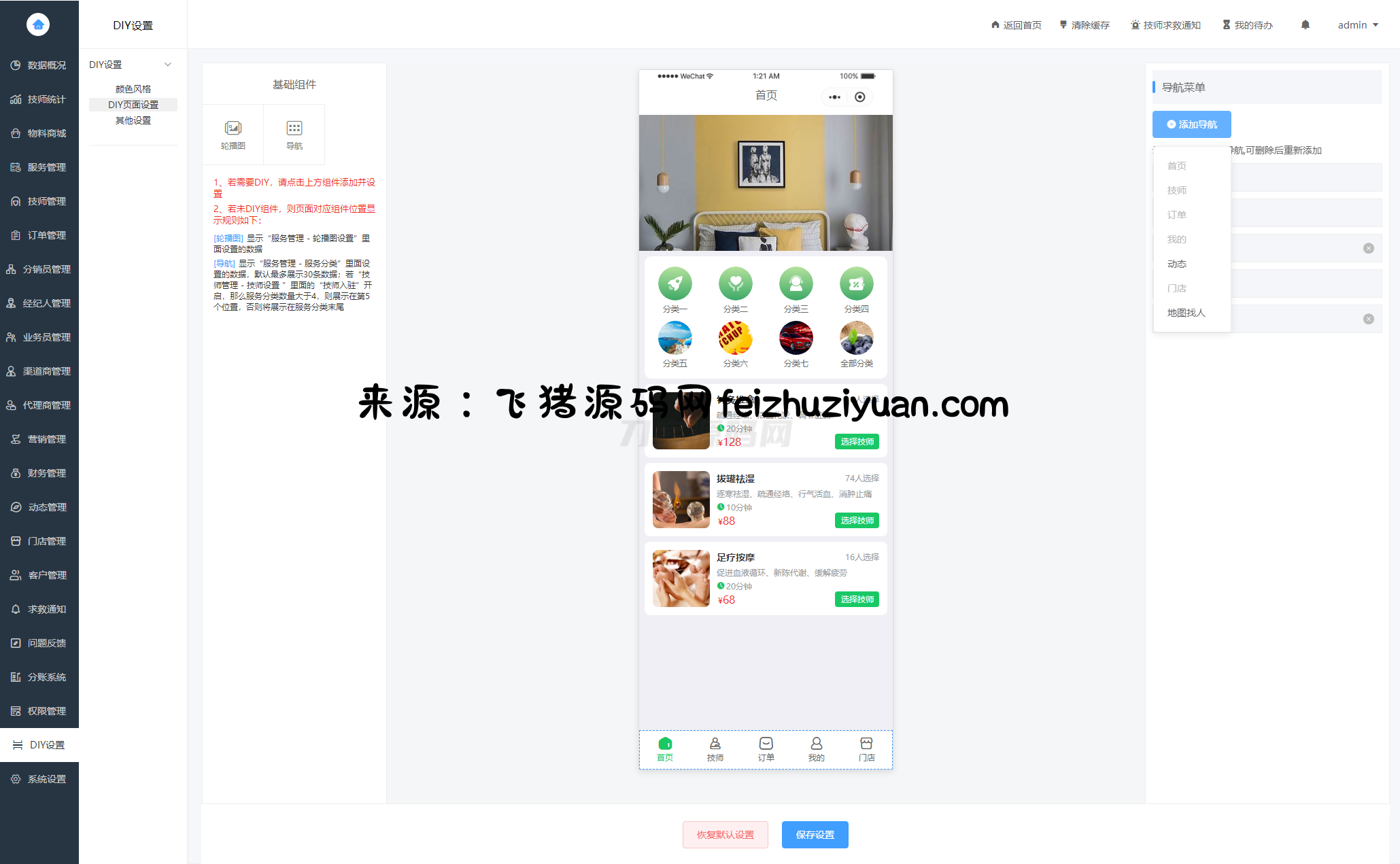 16、DIY设置( DIY页面设置,用户可以自由排版,任选链接页面或加减底部菜单 )