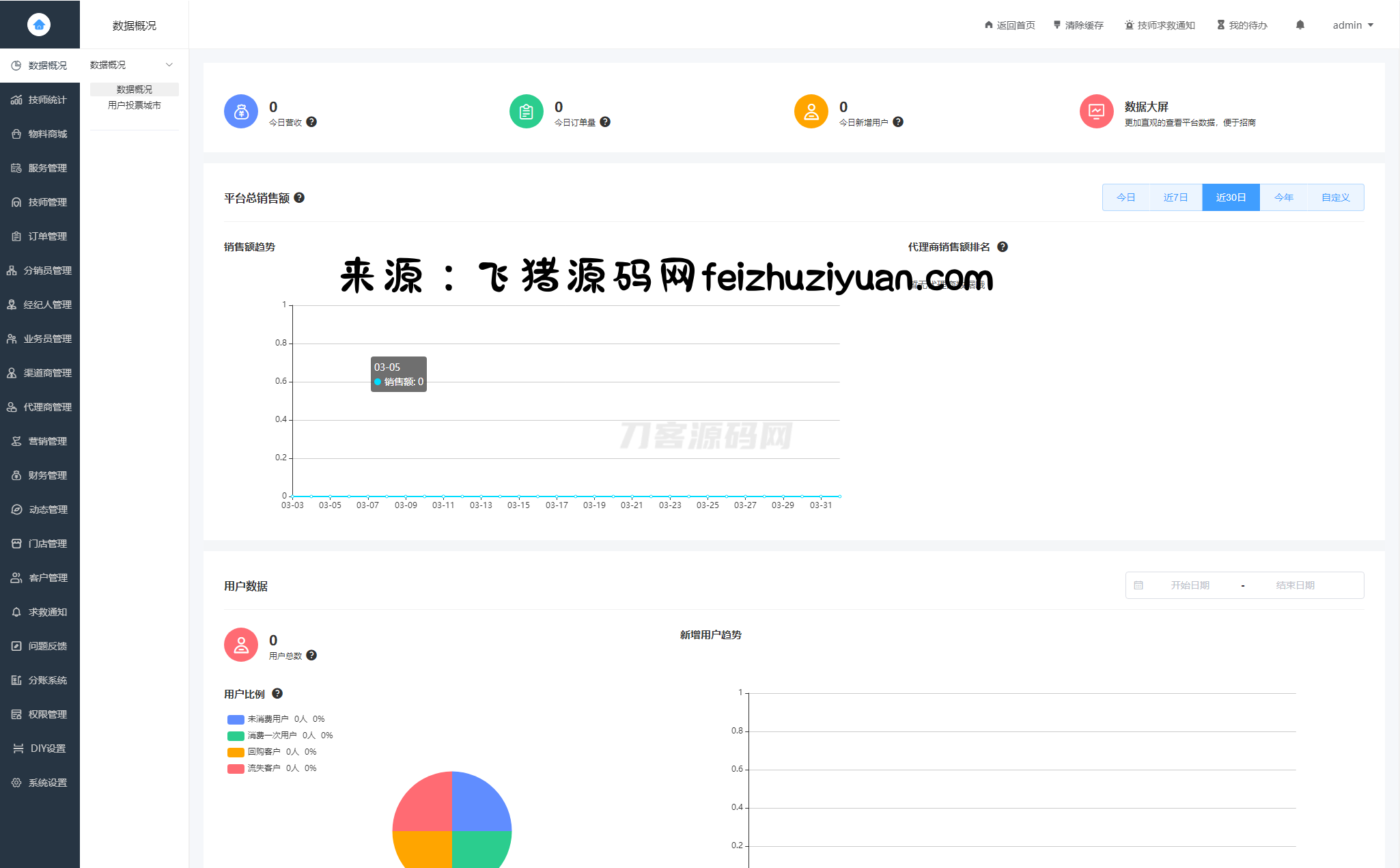 2、数据概况 (增加可视化数据大盘,代理商端可查看自己下面的技师服务时长、在线时长、业绩、积分、加钟率、退单率、退单数量、总订单量等数据,更加直观的查看平台数据,便于招商 )
