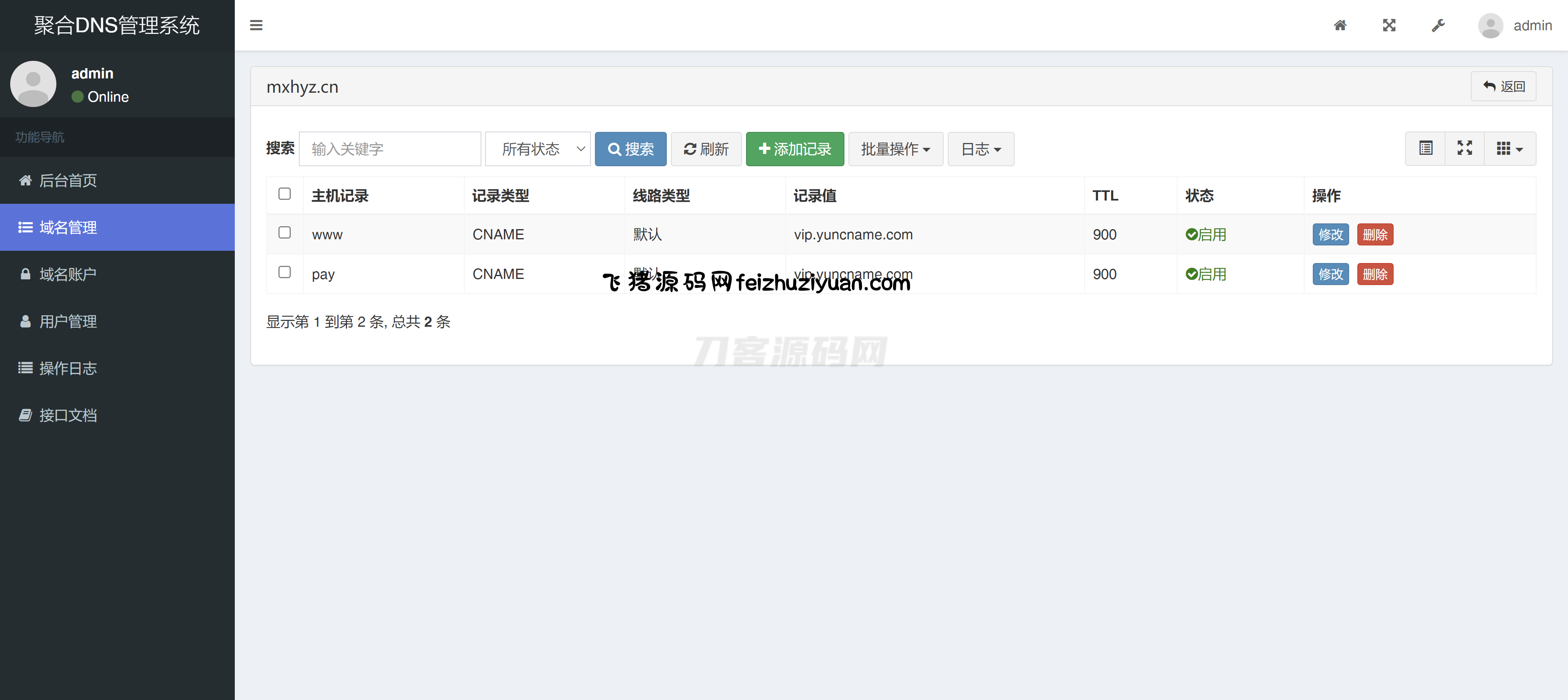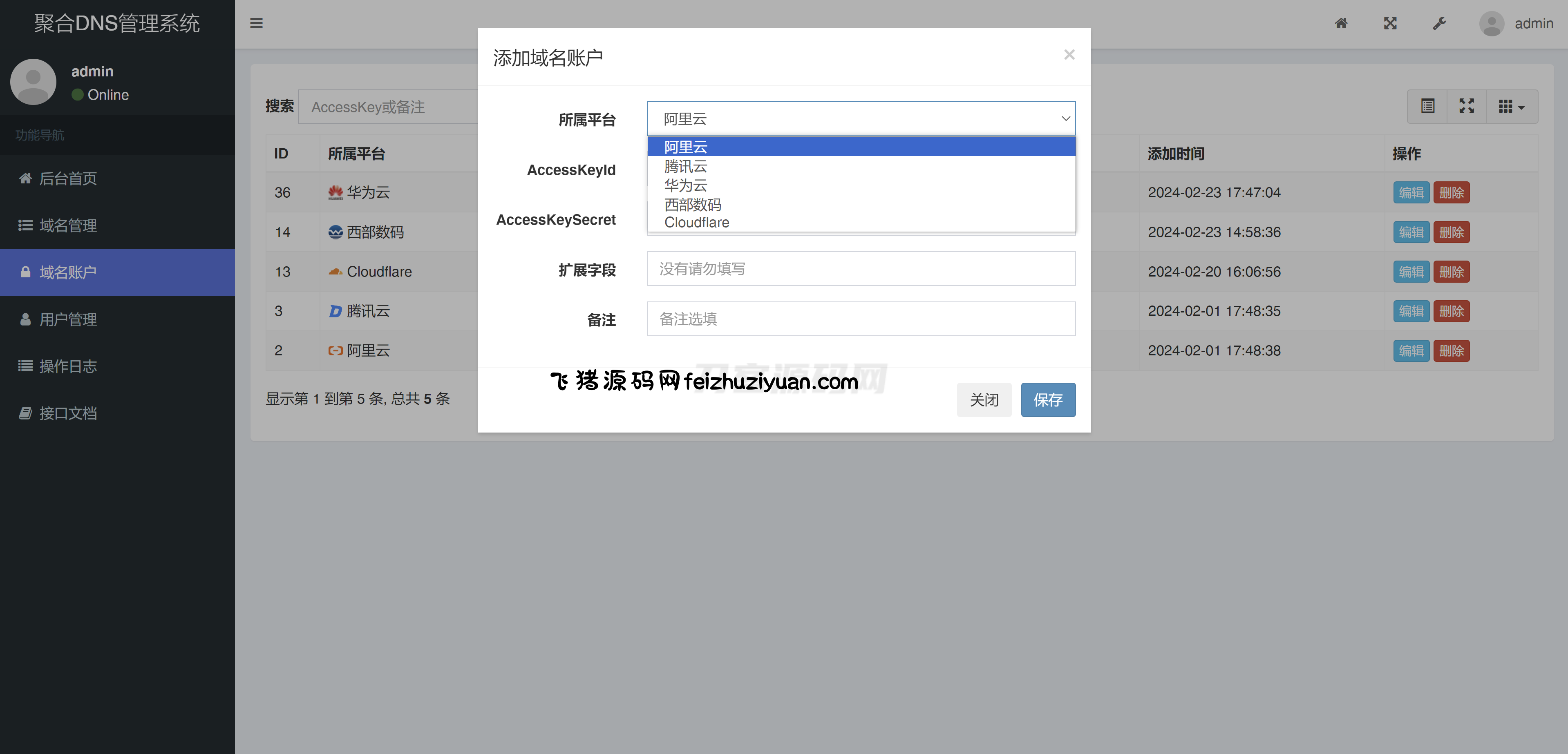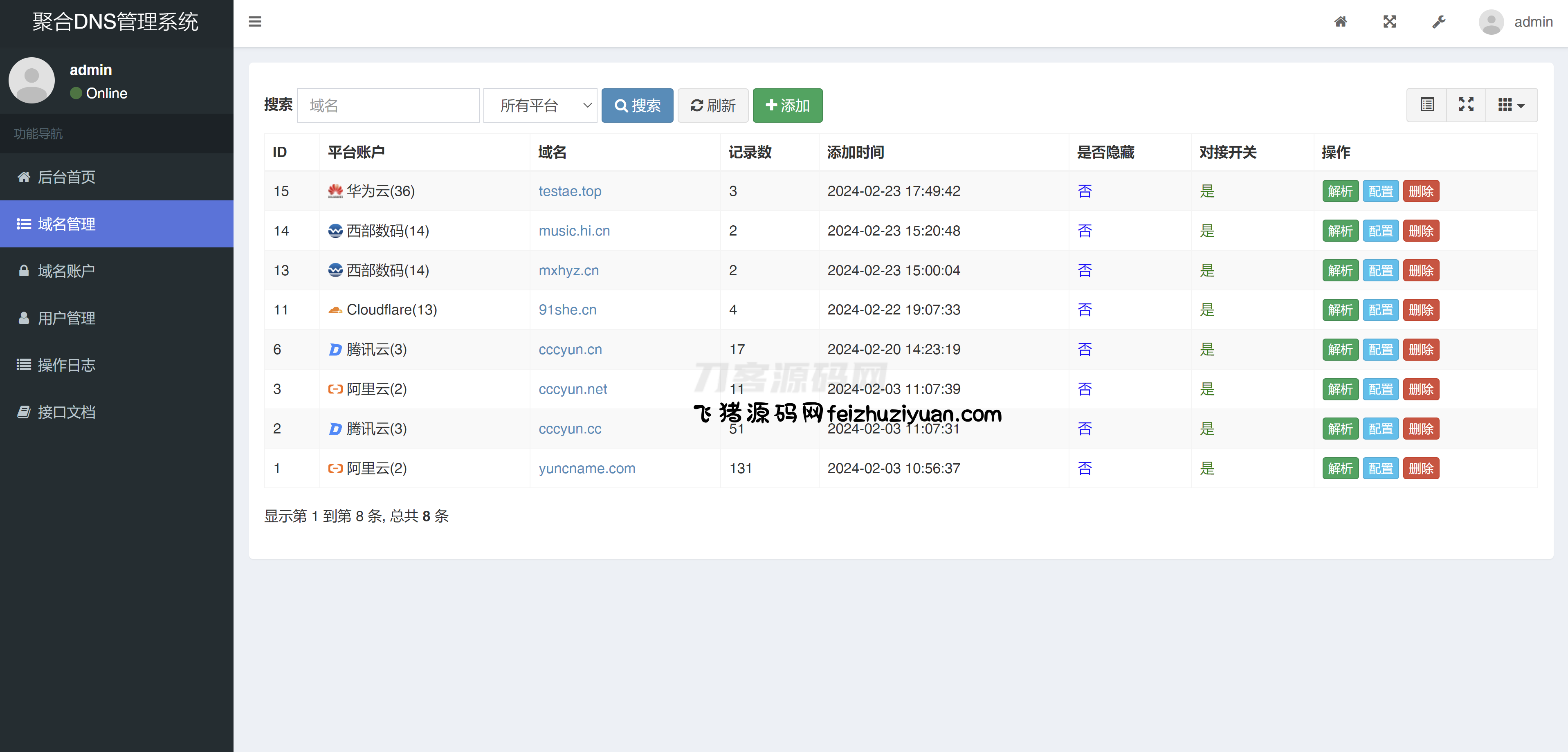 聚合DNS管理系统可以实现在一个网站内管理多个平台的域名解析,目前已支持的域名平台有:阿里云、腾讯云、华为云、西部数码、DNSLA、CloudFlare。